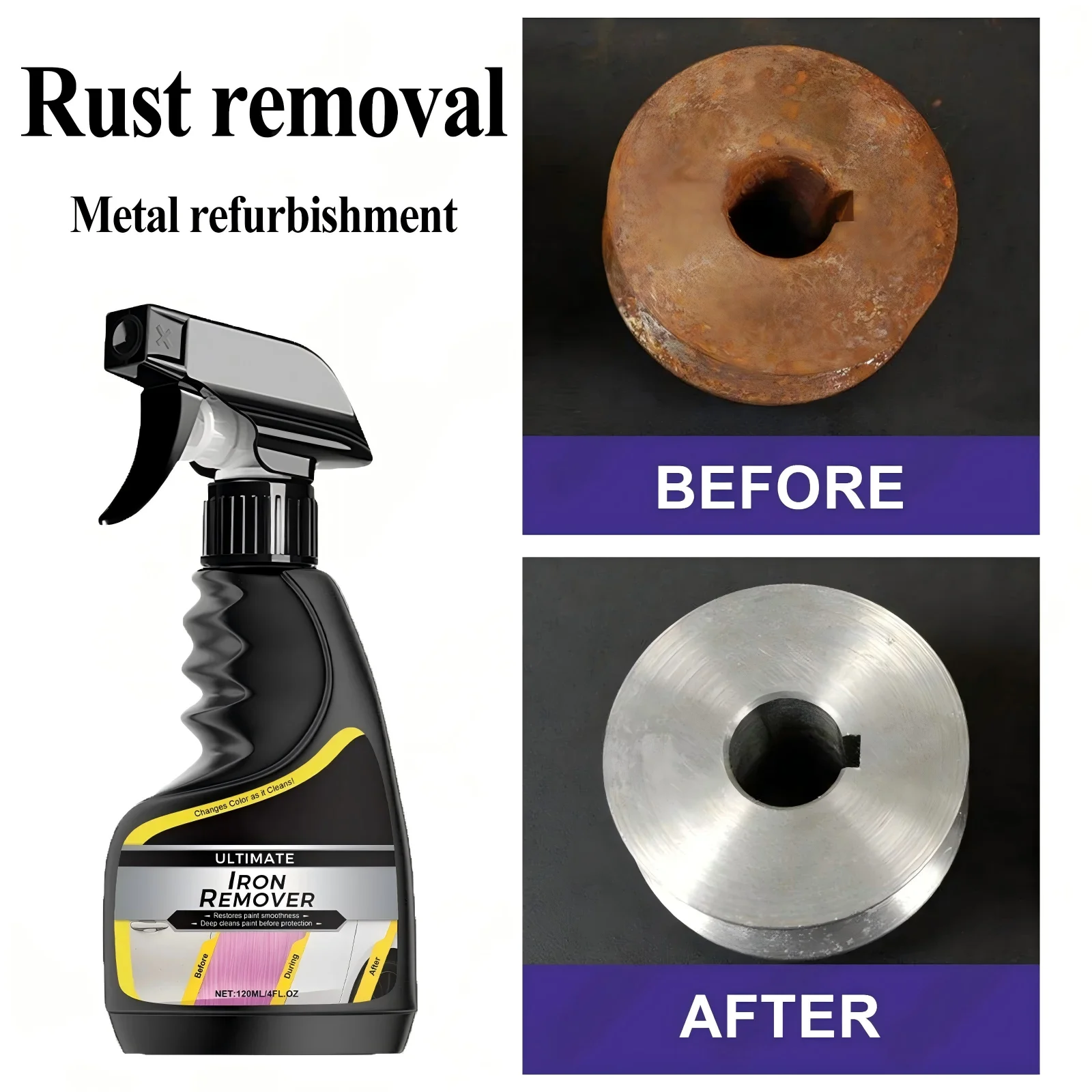 Ideal for automotive maintenance, this spray helps revive rust‑affected parts without harsh scrubbing. Simply apply to the affected area, let it penetrate, and wipe away loosened rust for a clean and smooth finish. It’s also effective on iron powder stains and oxidized metal parts around the vehicle.